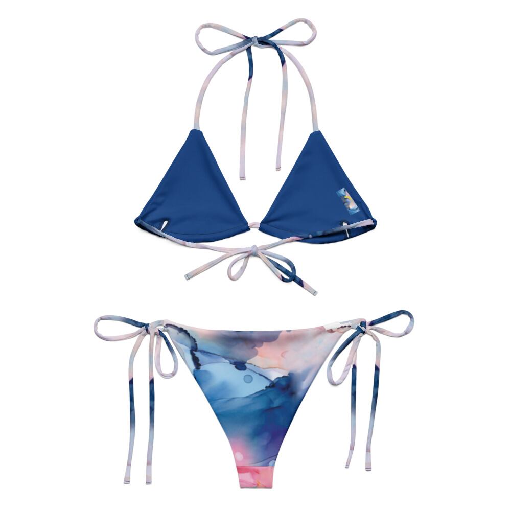 水彩アートみたいなデザインが可愛すぎる!!! ピンクとネイビーのウォーターペイント柄が大人っぽくておしゃれなストリングビキニセット!調節可能なストリングトップ&ボトムで、自分にぴったりのフィット感に調整できるから、ビーチでもプールでも快適✨ 柔らかいリサイクルポリエステル製で環境にも優しく、UVカット (UPF 50+) 機能付きだから、日差しの強い日も安心。 アート好き&個性的なスタイルが好きな人にぴったりのビキニ!