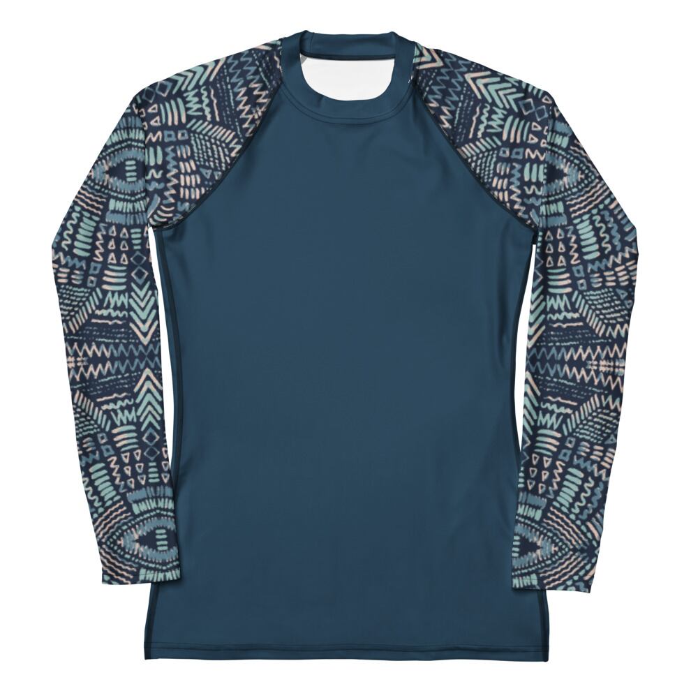 Make a statement with the “Lagoon Rhythm” rash guard, featuring deep lagoon blue tones and tribal-inspired sleeve patterns. Stylish yet subtle, this piece blends function with artistry. Made from soft, recycled materials with UPF 50+ sun protection and four-way stretch for total comfort on land or sea.