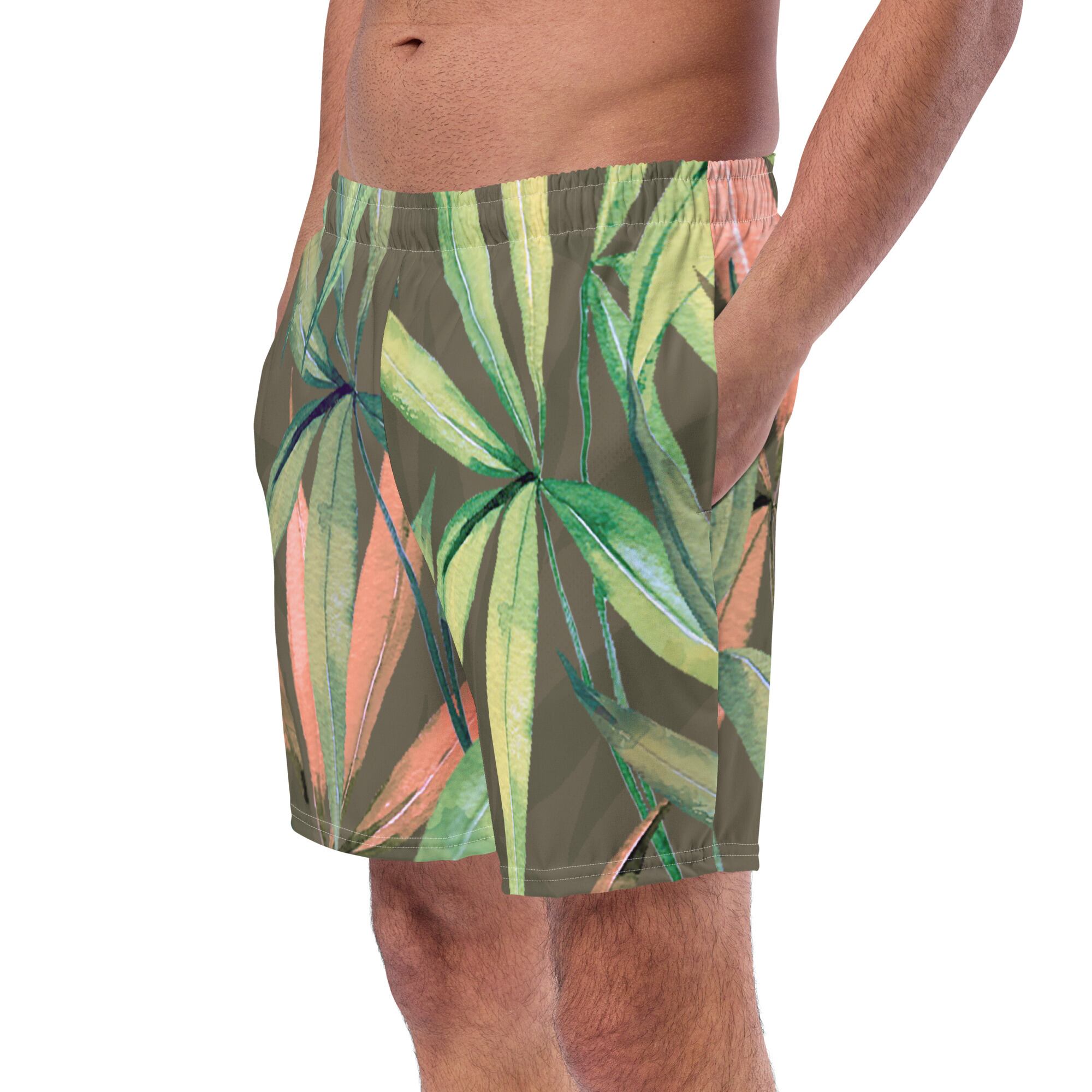 Explore the wild side of summer with our Jungle Canopy Swim Trunks! These unique trunks feature an artistic print of lush, oversized leaves in shades of green and subtle coral, set against a versatile earthy tone. Designed for both performance and leisure, they're made from recycled fabric, offering quick-dry breathability perfect for any water adventure or just relaxing in nature.