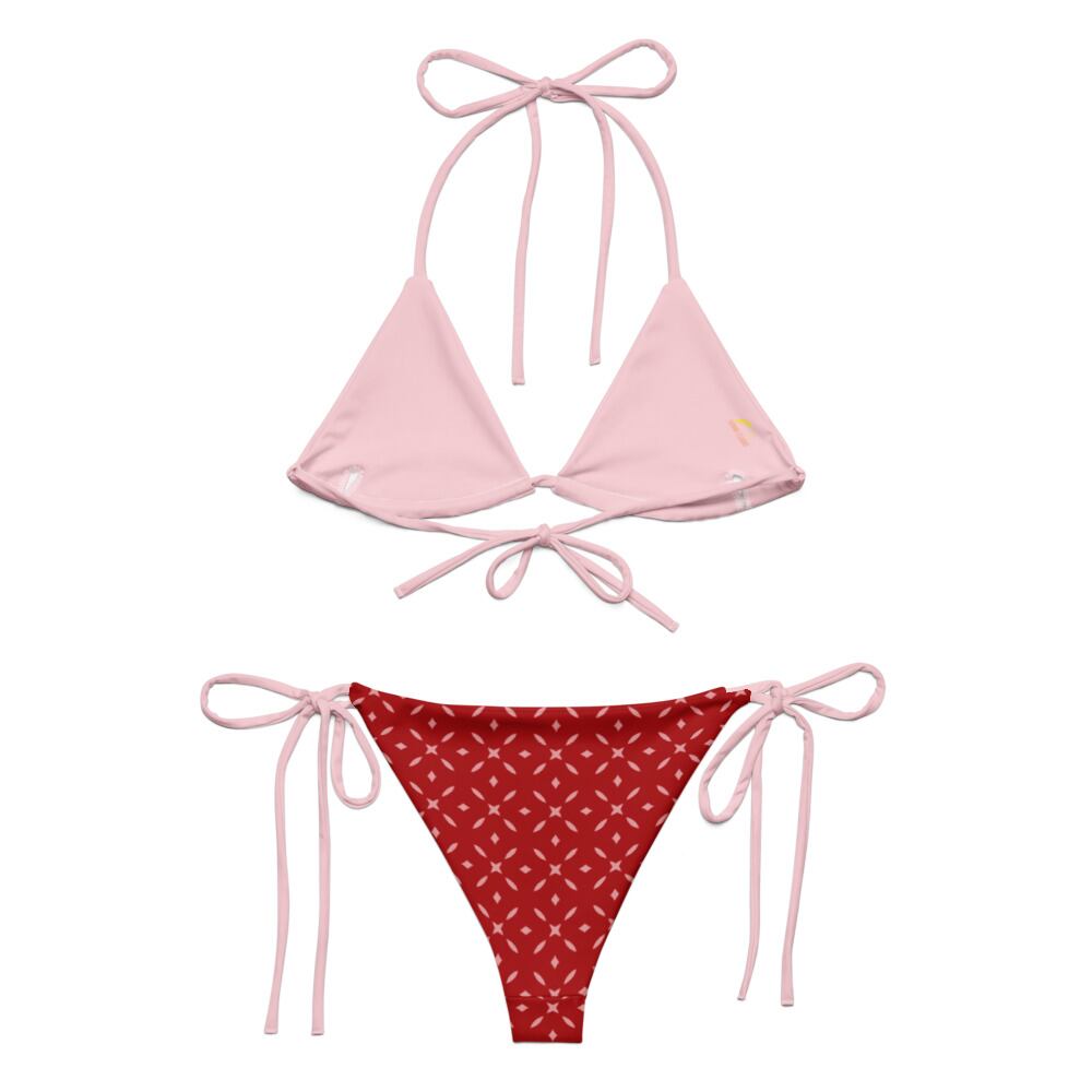 伝統の美しさと現代的な遊び心が出会う「サクラリズム・リサイクルストリングビキニ」。やわらかなピンクの紐と、桜から着想を得た赤のパターンが印象的。リサイクル素材から作られており、地球にも優しい一着です。太陽の下で、あなたらしい魅力を輝かせて。