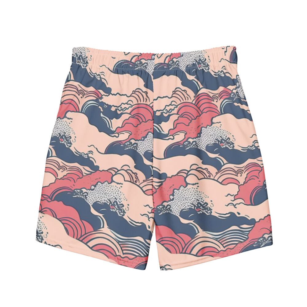 Ride the style wave with our Ocean Waves Swim Trunks! These eye-catching trunks feature a dynamic and artistic wave pattern in a captivating palette of soft coral pink, deep navy, and refreshing light blue, reminiscent of the vibrant colors of a coral reef. Designed for both performance and leisure, they're made from recycled fabric, offering quick-dry breathability perfect for catching waves or simply enjoying a relaxing day by the water.
