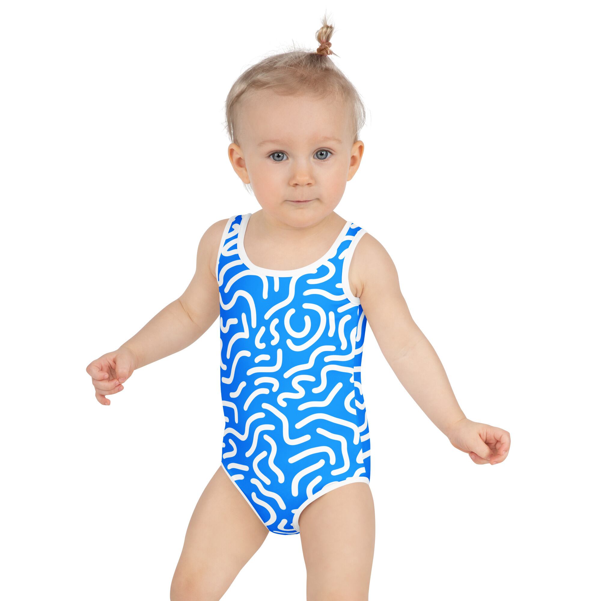 Splash into endless fun with our Aqua Squiggle Kids' Swimsuit! This adorable one-piece features a vibrant blue background adorned with a playful, abstract pattern of white squiggly lines, just like little waves or happy doodles. Designed for comfort and durability, it's made from soft, stretchy recycled fabric, ensuring your little one can move freely while playing in the water. With UPF 50+ protection, it's perfect for sunny days at the beach or pool!