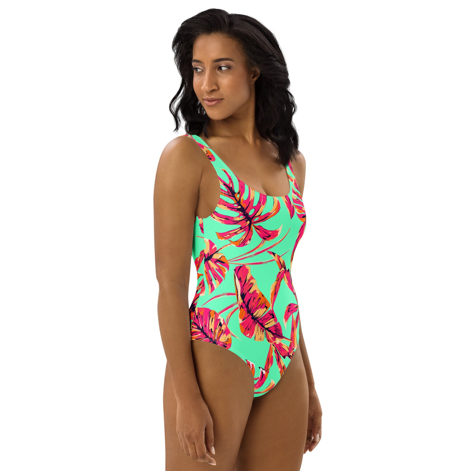 Escape to your own paradise with our Tropical Oasis One-Piece Swimsuit! This stunning swimsuit features an invigorating mint green background adorned with bold, oversized tropical leaves in vibrant shades of fuchsia, orange, and coral. Designed for both comfort and standout style, it's made from soft, stretchy recycled fabric, providing a flattering fit and maximum comfort for all-day wear. The double-layered construction ensures extra comfort and coverage, while UPF 50+ protection keeps you safely enjoying the sun.