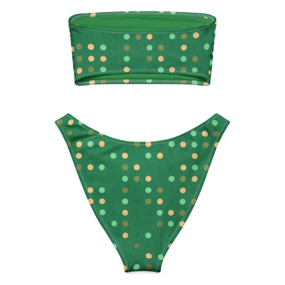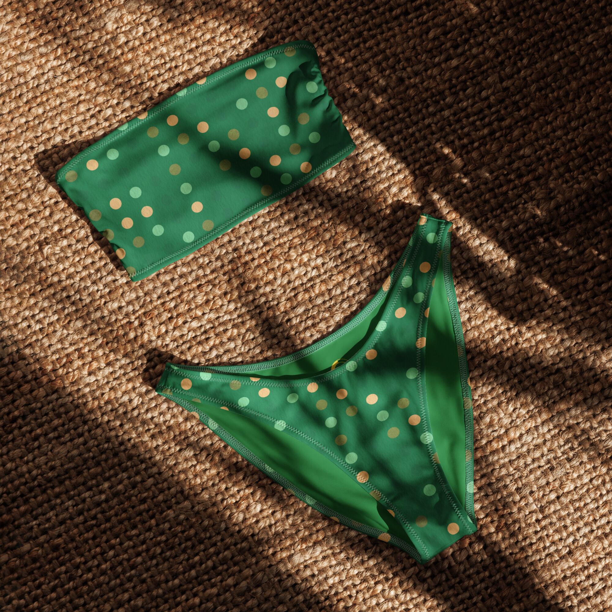 Turn up the charm in this eco-friendly bandeau bikini, featuring playful colorful polka dots on a bold green base. Made from recycled materials, it's the perfect pick for a carefree day in the sun—minimal tan lines, maximum style.