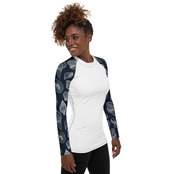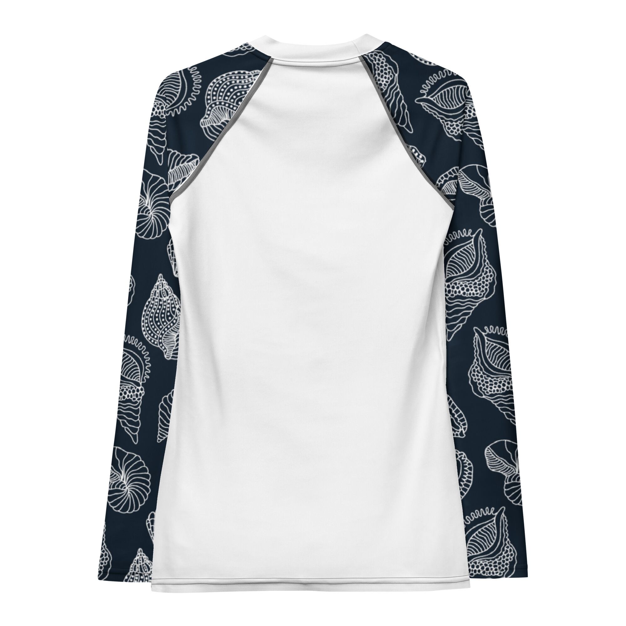 Stay protected and stylish on every beach adventure with the Midnight Tide Women’s Rash Guard. Designed with sleek white panels and dark navy sleeves adorned with delicate shell outlines, it’s the perfect balance of function and coastal elegance. Great for surfing, paddleboarding, or sun-safe lounging.