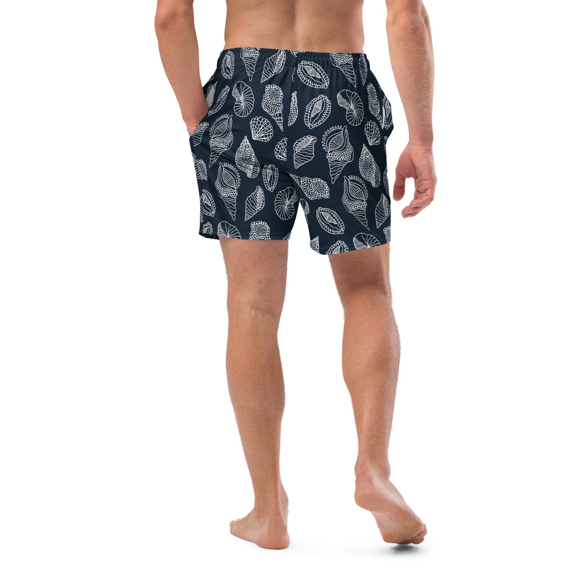 With a deep navy base and flowing white shell patterns, these swim trunks capture the calm and rhythm of the ocean at night. Lightweight and quick-drying, they’re built for comfort in and out of the water. Whether you’re swimming, paddleboarding, or just relaxing on shore, they move with you and keep the vibe easy. Made from recycled materials for a style that’s as responsible as it is timeless.