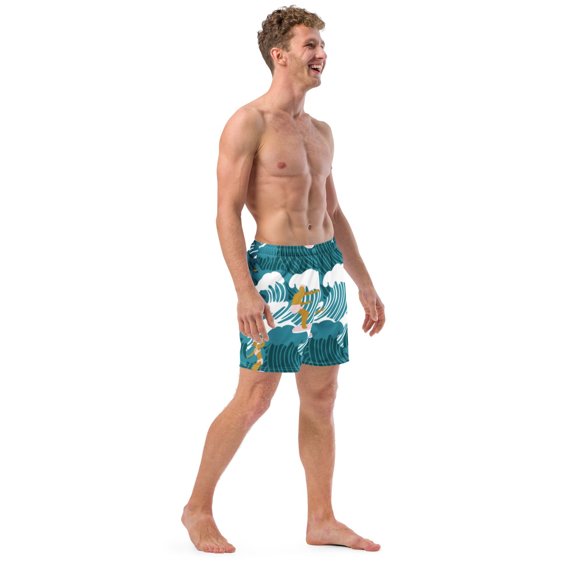 Hang ten in style with our Surfer Wave Men's Swim Trunks! Featuring the same awesome design as the rest of our Surfer Wave collection, these trunks showcase dynamic turquoise and white waves with cool surfer figures riding the barrels. Made from soft, quick-drying recycled fabric, they're perfect for catching a real wave or just chilling by the beach. With a comfortable elastic waistband, drawcord, and practical pockets, you'll be ready for any water adventure. Plus, they offer UPF 50+ protection for those long days in the sun.
