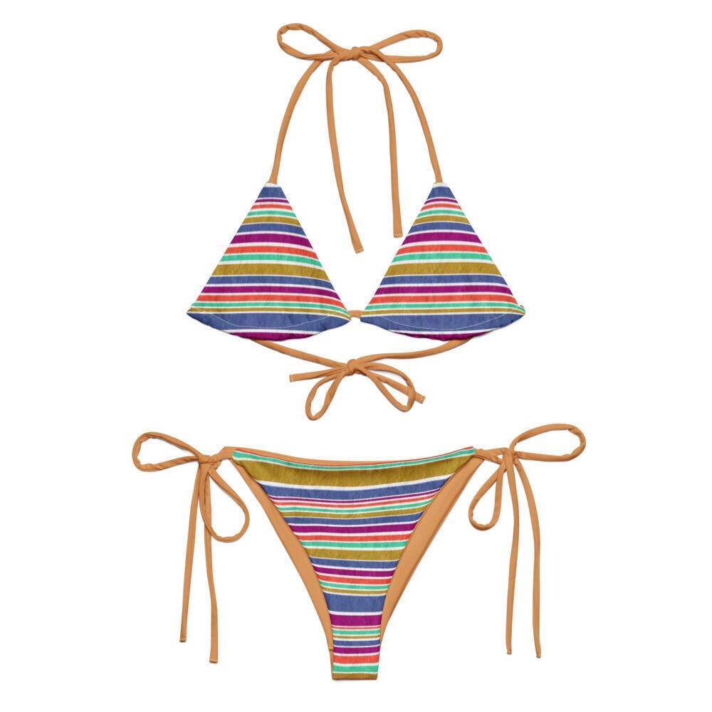 Bring a burst of color to your beach days with the Sunset Fiesta String Bikini. Featuring bold multi-colored stripes and warm tan ties, it blends playful energy with timeless style. Adjustable strings give you a perfect, flattering fit — ideal for dancing under the sun or lounging by the waves.