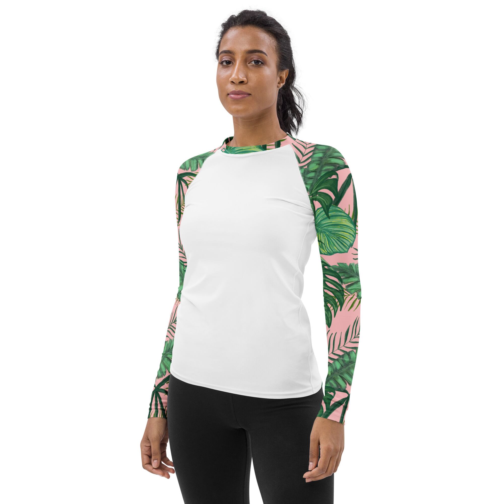 南国のグリーンリーフと淡いピンクが描く「Tropical Blush Women's Rash Guard」。
