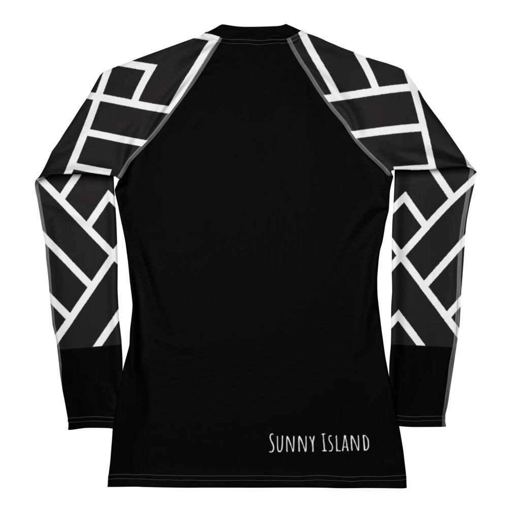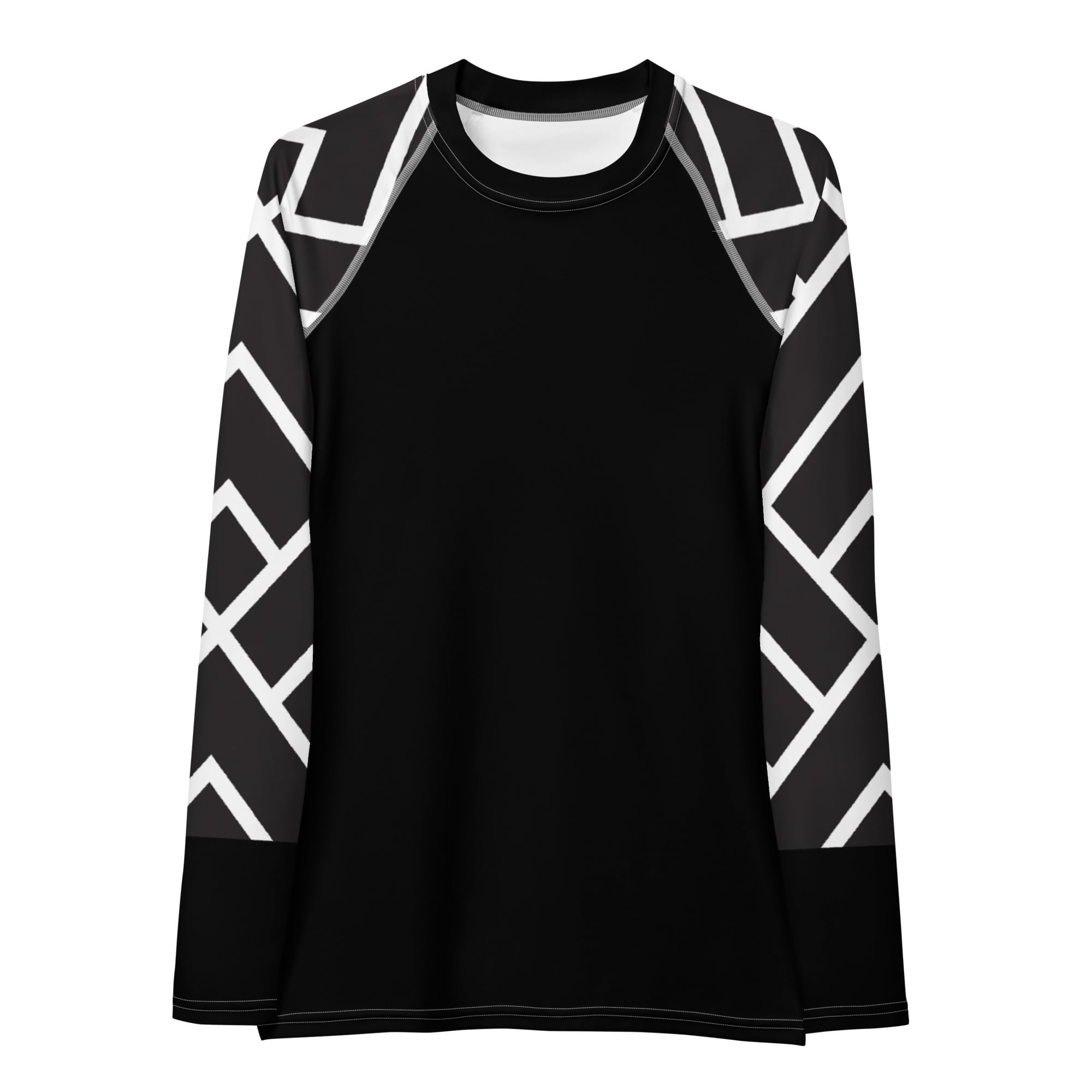 The Monochrome Maze Rash Guard features a sharp black base with striking geometric sleeves that instantly elevate your swim look.