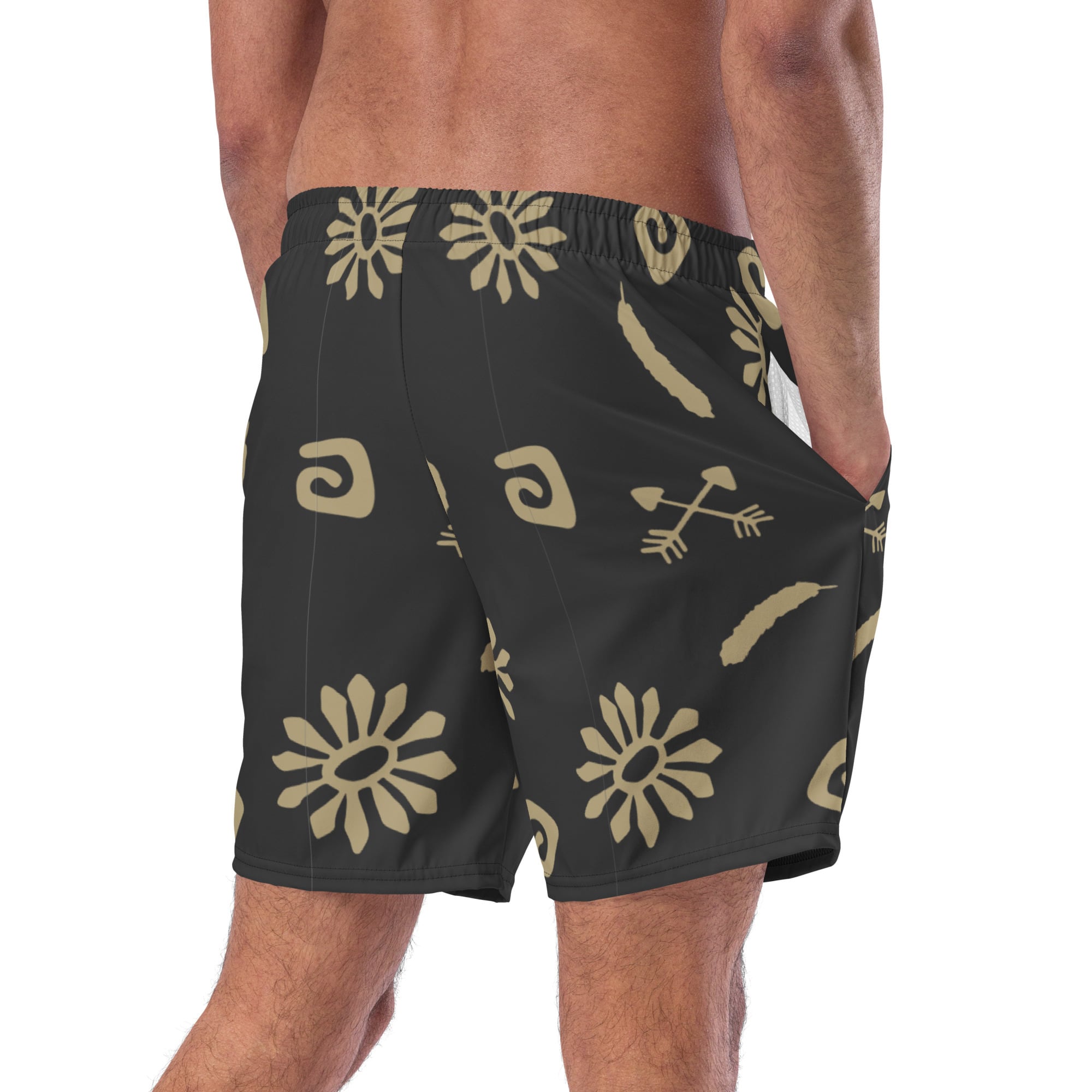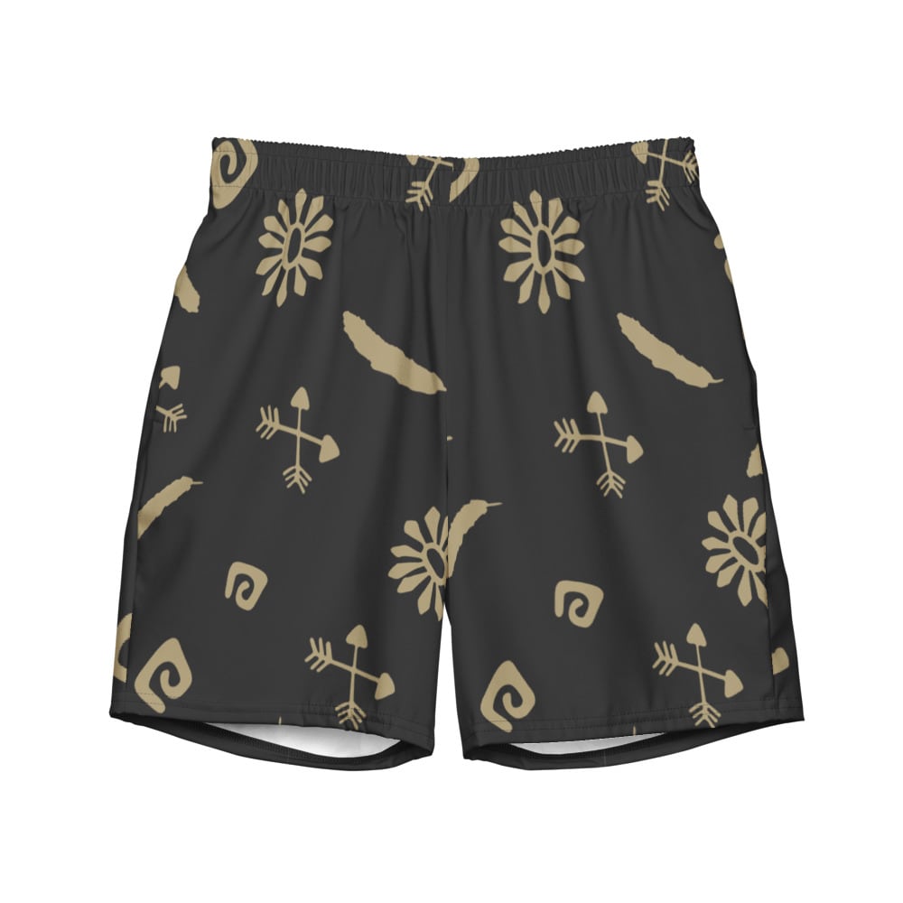 The Desert Symbol Swim Trunks feature a deep charcoal base with muted sand-toned motifs inspired by natural elements and ancient symbols.