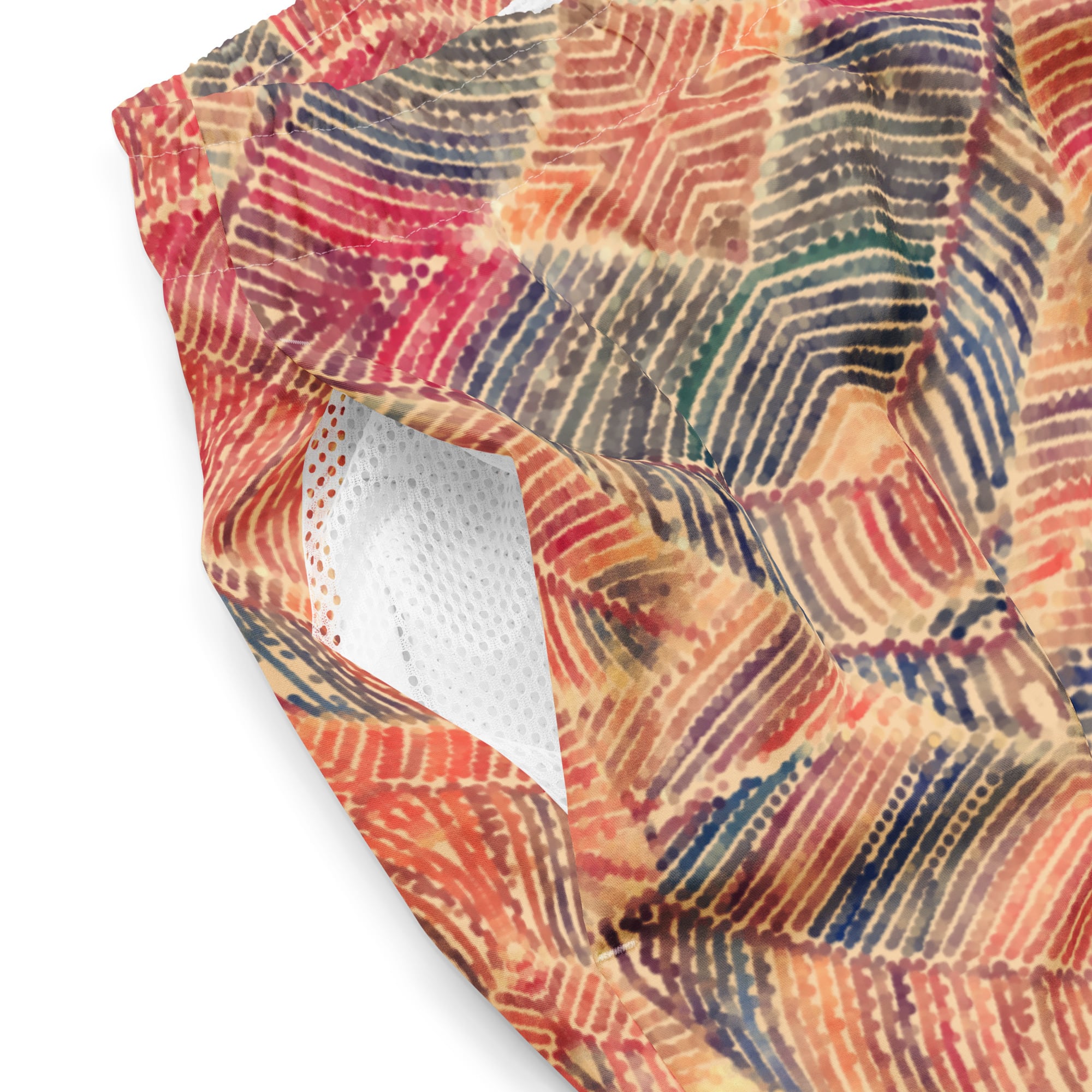 The Sunset Tribal Wave Swim Trunks feature layered tribal-inspired patterns in warm sunset tones, creating depth and movement in every detail.